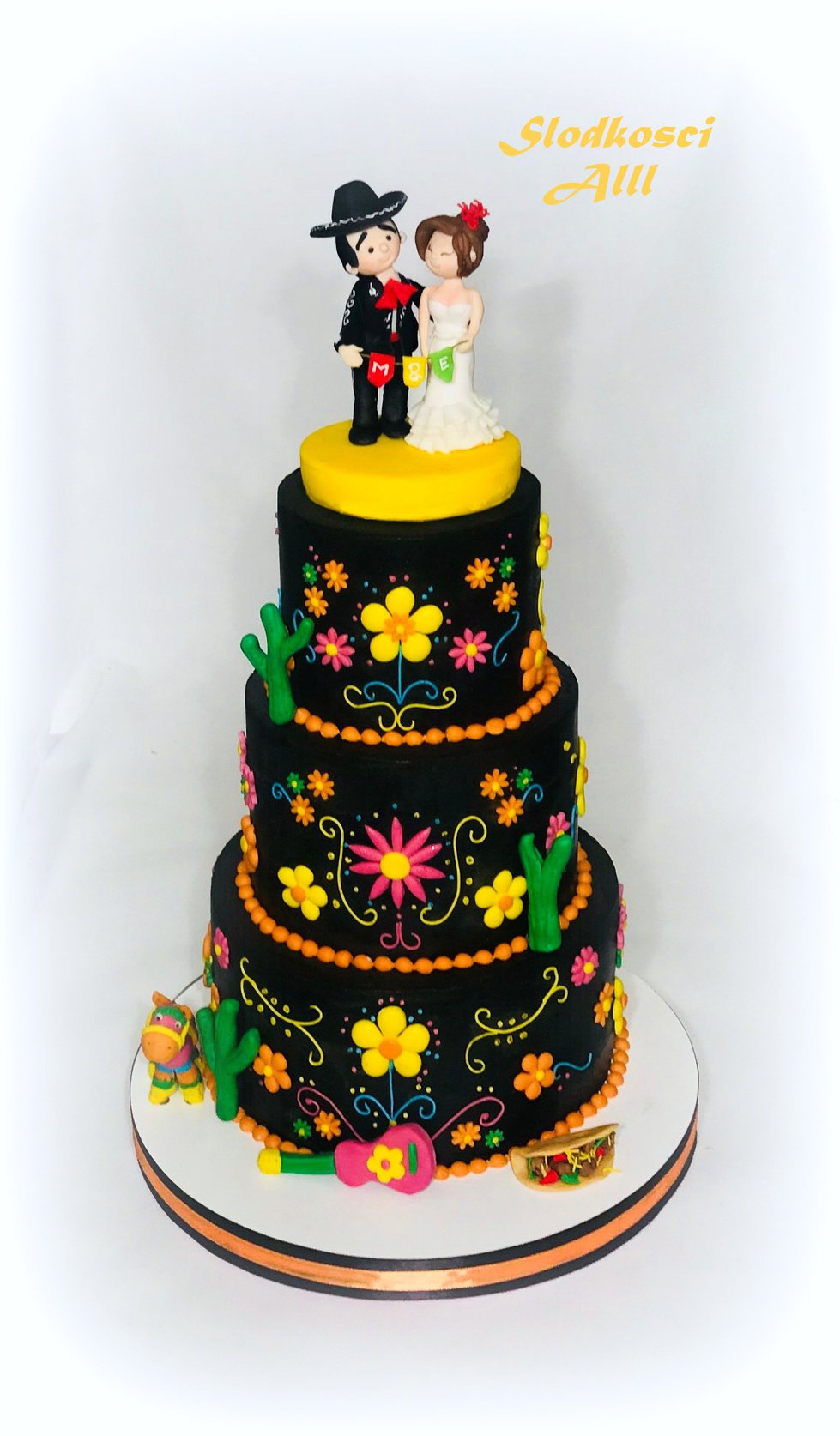 Wybór tortu wcale nie jest taki łatwy. Najpierw szukaliśmy w tradycyjnych sieciówkach, jak Elite czy Gruszecki. Tamtejsze torty to jeden wielki, słodki krem, a tort na 50 osób to koszt prawie 1000 zł. Połowa mojej pensji. 🙂 Szukaliśmy osoby która zrobiła by tort z ozdobami w stylu meksykańskim. Miała to być niespodzianka. Nie łatwo znaleźć utalentowaną osobę. Większość cukierni stawia na naked cake bo to najprostsza forma. Fajnie wygląda, ale to nie to co chcieliśmy. Po nitce do kłębka trafiliśmy na Panią Alinę, którą z całym sercem polecam. Prawdziwa pasjonatka i artystka. Spędziłyśmy na telefonie dobrą godzinę rozmawiając o projekcie i pomysłach. Co ważne torty Pani Aliny nie tylko są piękne, ale też bardzo smaczne. Nasz tort nie był typowy, bo nie był biały.